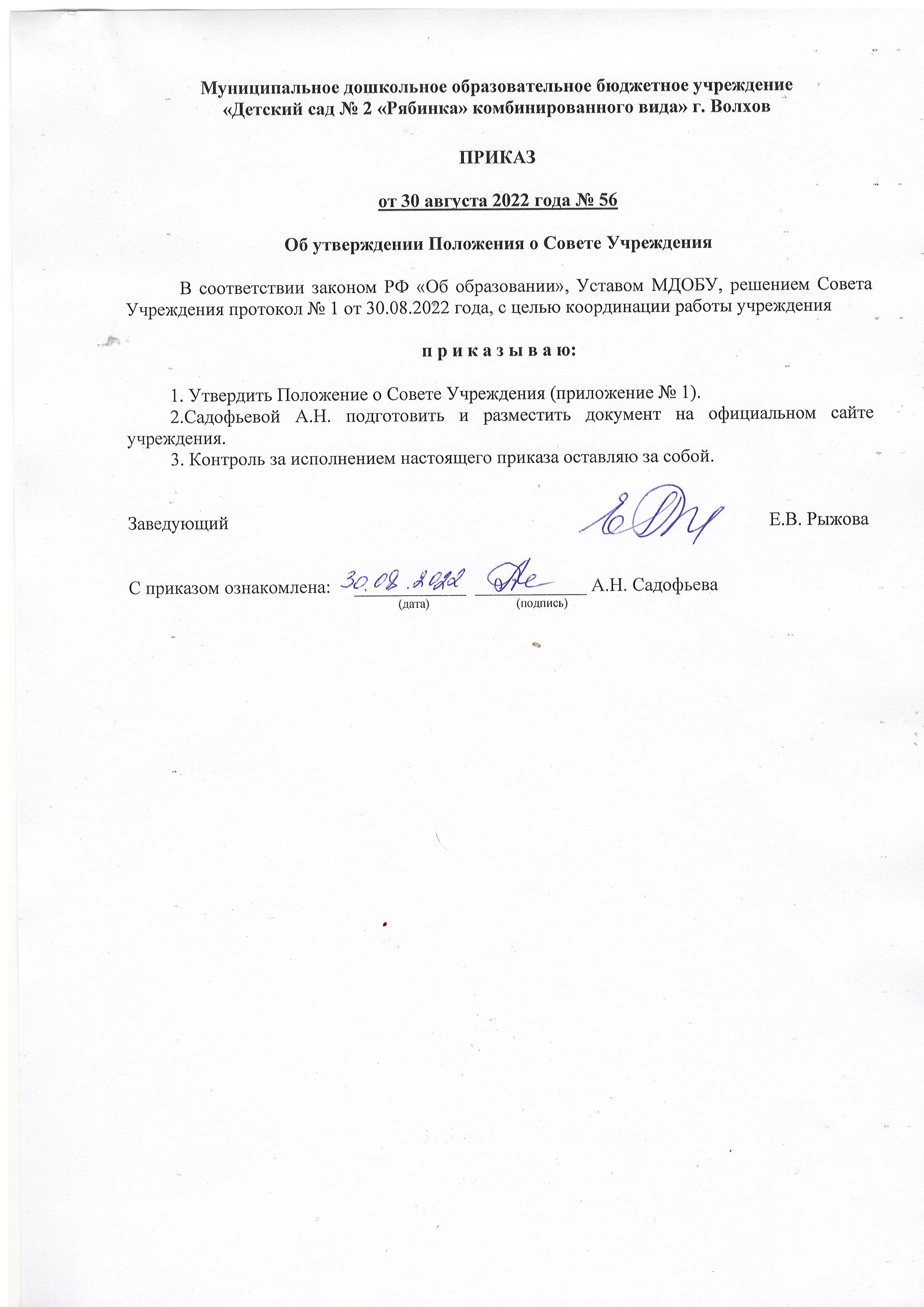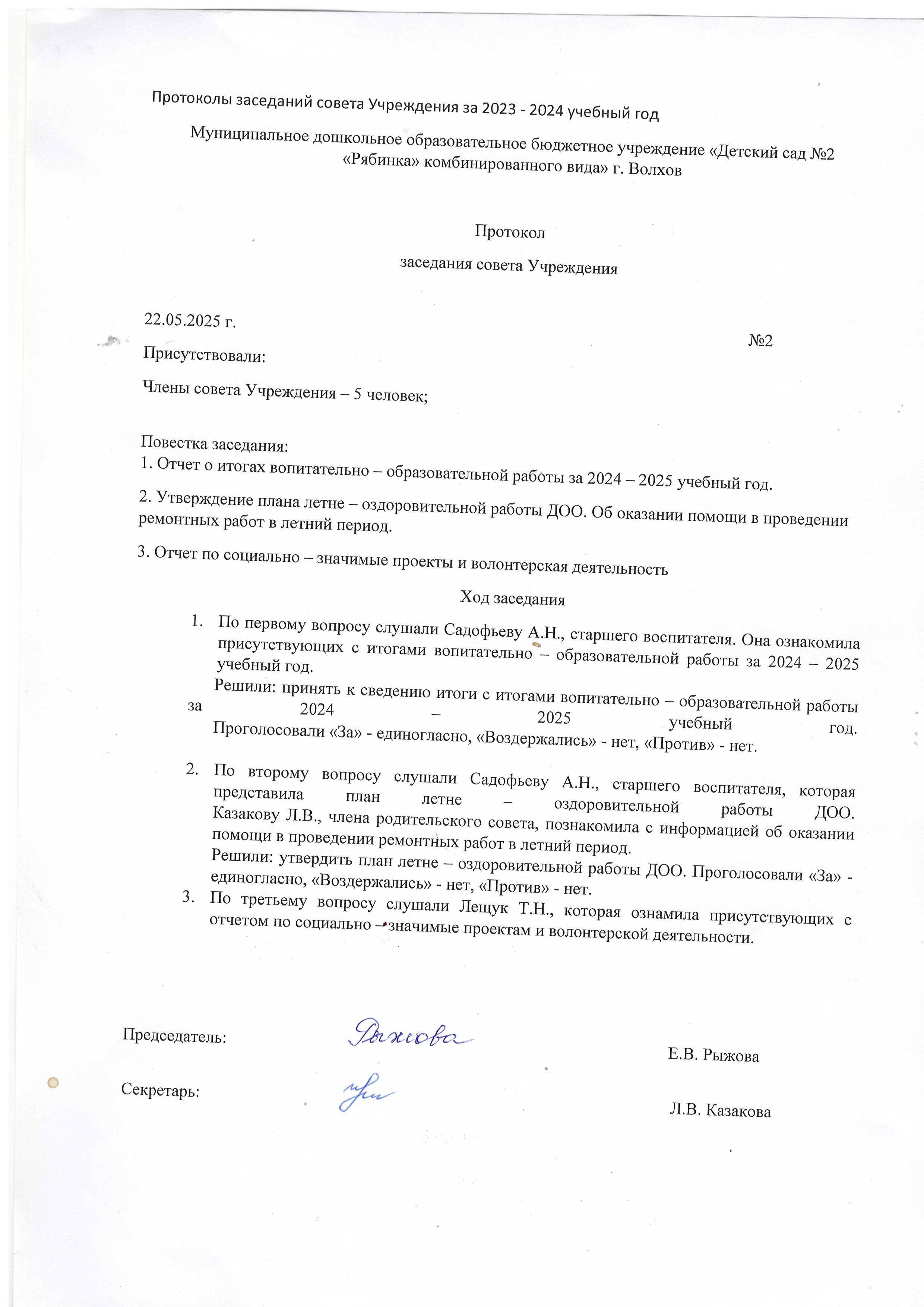 14 октября 2025 года состоялось первое в этом учебном году заседание совета Учреждения. Первым вопросом были выборы председателя совета. Им единогласно избран кооптированный член совета Глава МО г. Волхов Сагайдачный Роман Александрович. Его заместителем стала Кузьмина Екатерина Владимировна, мама Кузьминой Аделины. Присутствующие заслушали отчёт заведующего Рыжовой Е. В. о предварительных итогах независимой оценки качества образования, реализованных проектах в прошлом учебном году, наметили план работы на год.