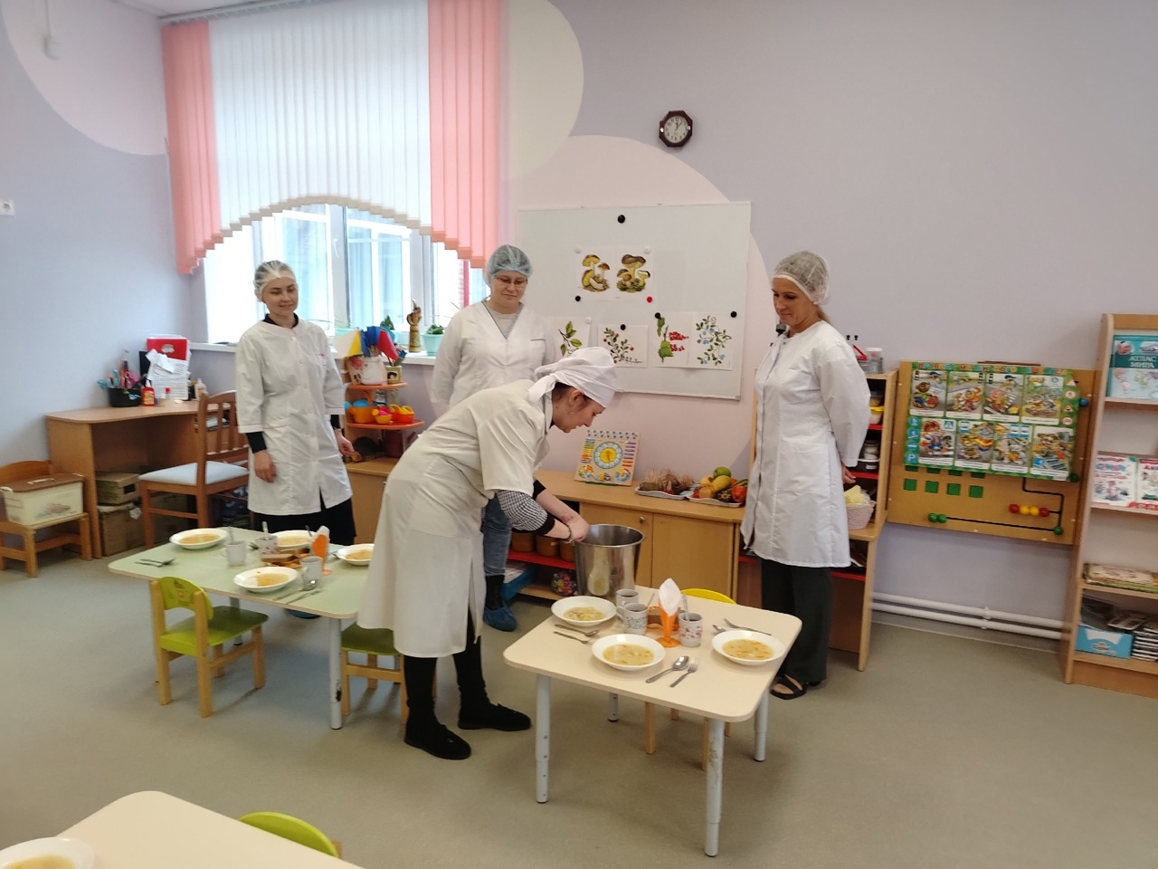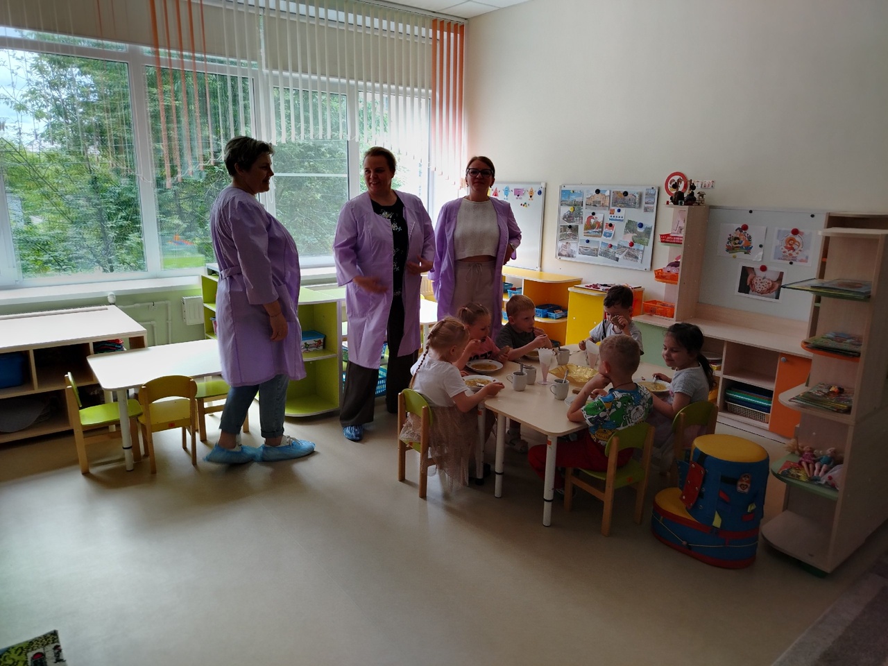 Они убедились, что в группах создана благоприятная эмоциональная обстановка во время приема пищи. Дети обеспечены соответствующей посудой, столы и стулья соответствуют ростовым показателям.